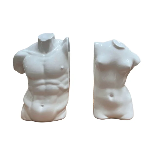 Portalibros de cerámica blanca que representan un torso masculino y uno femenino, ideales para añadir un toque artístico a cualquier espacio.