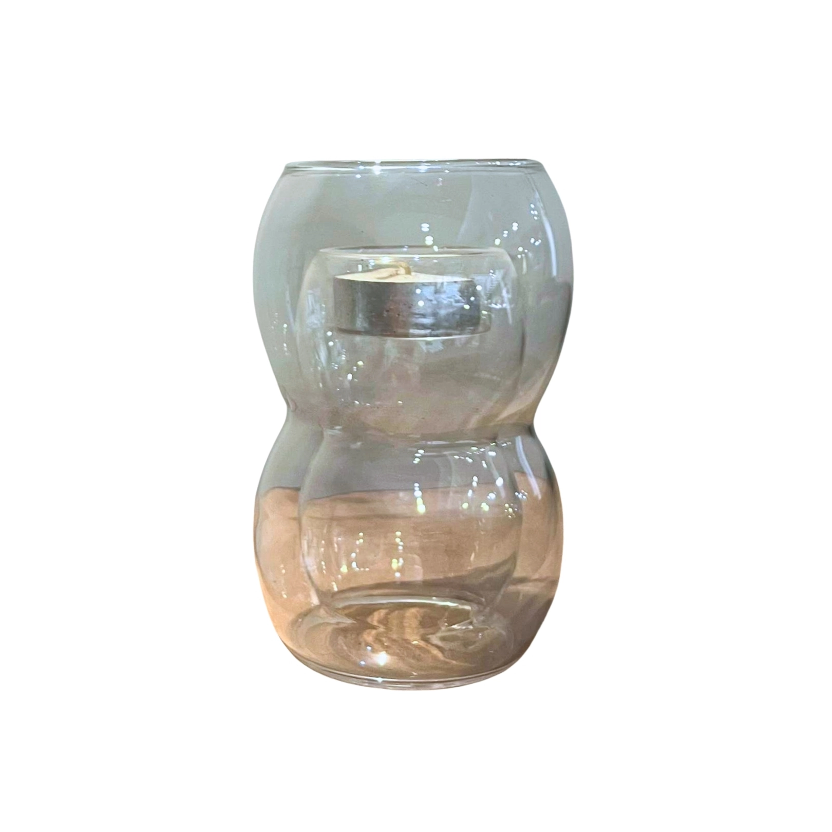 Portavela de vidrio doble con forma de reloj de arena. Diseño moderno y elegante para un ambiente acogedor.