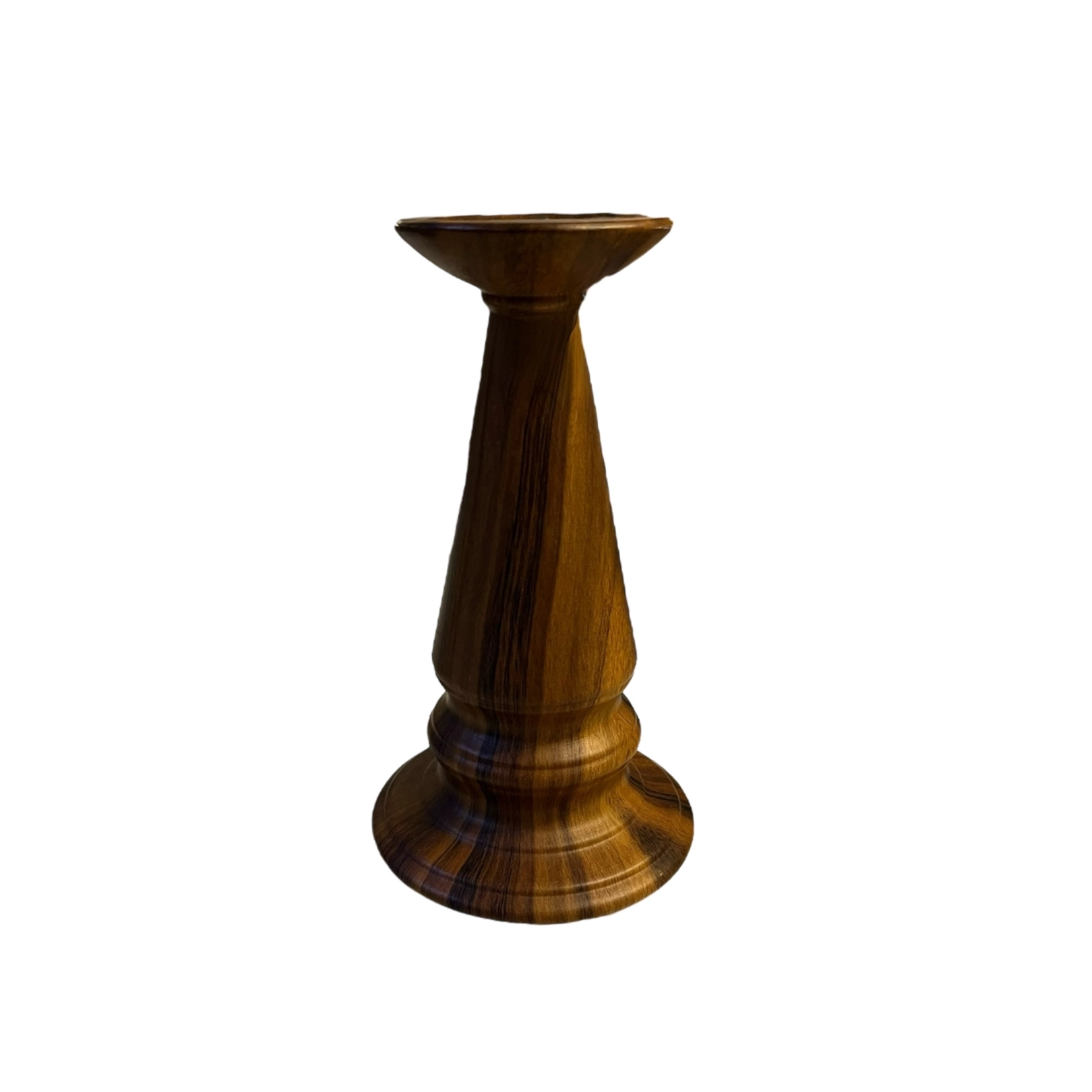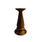 Portavelas de madera en tono oscuro. Diseño cónico con base acampanada para un toque rústico y elegante.