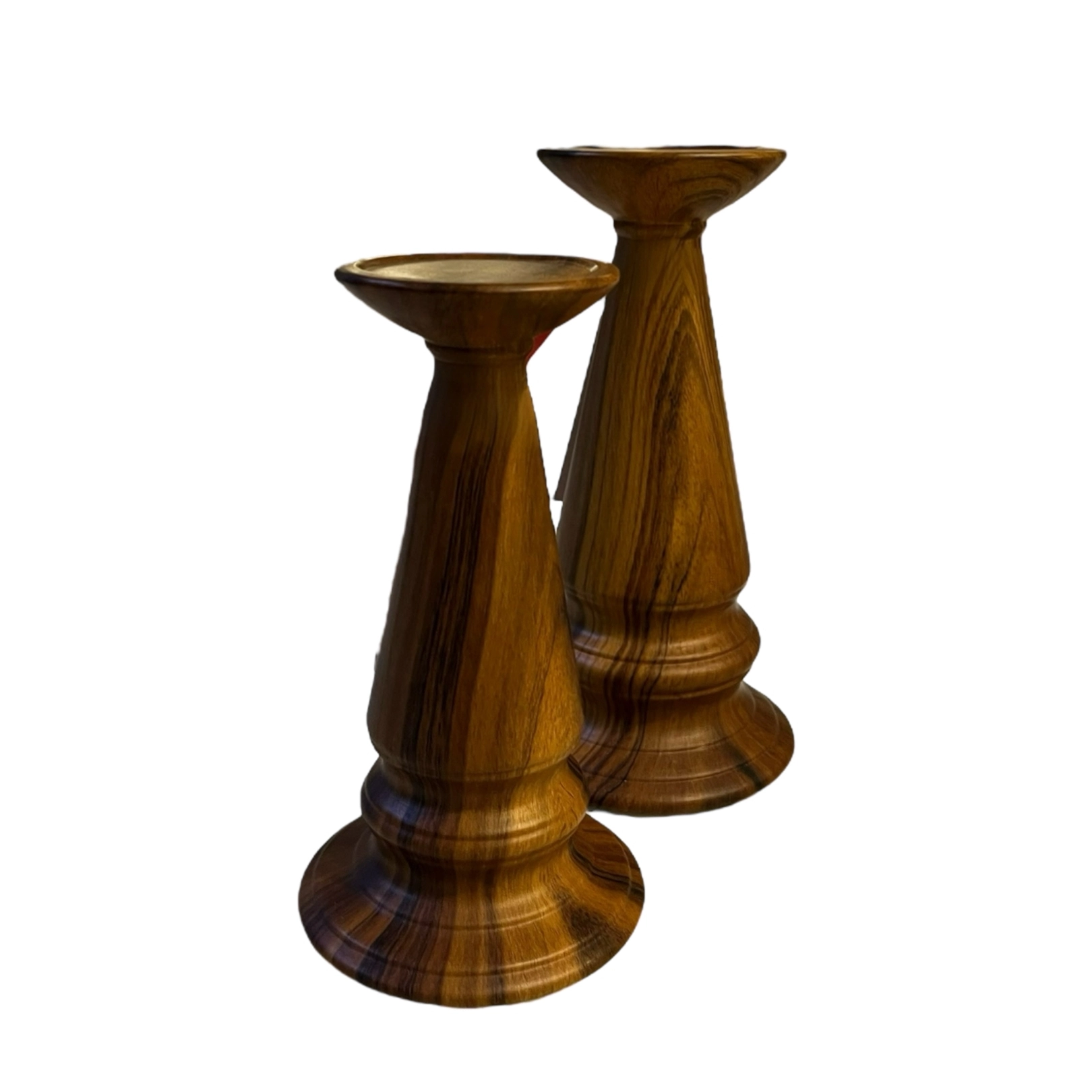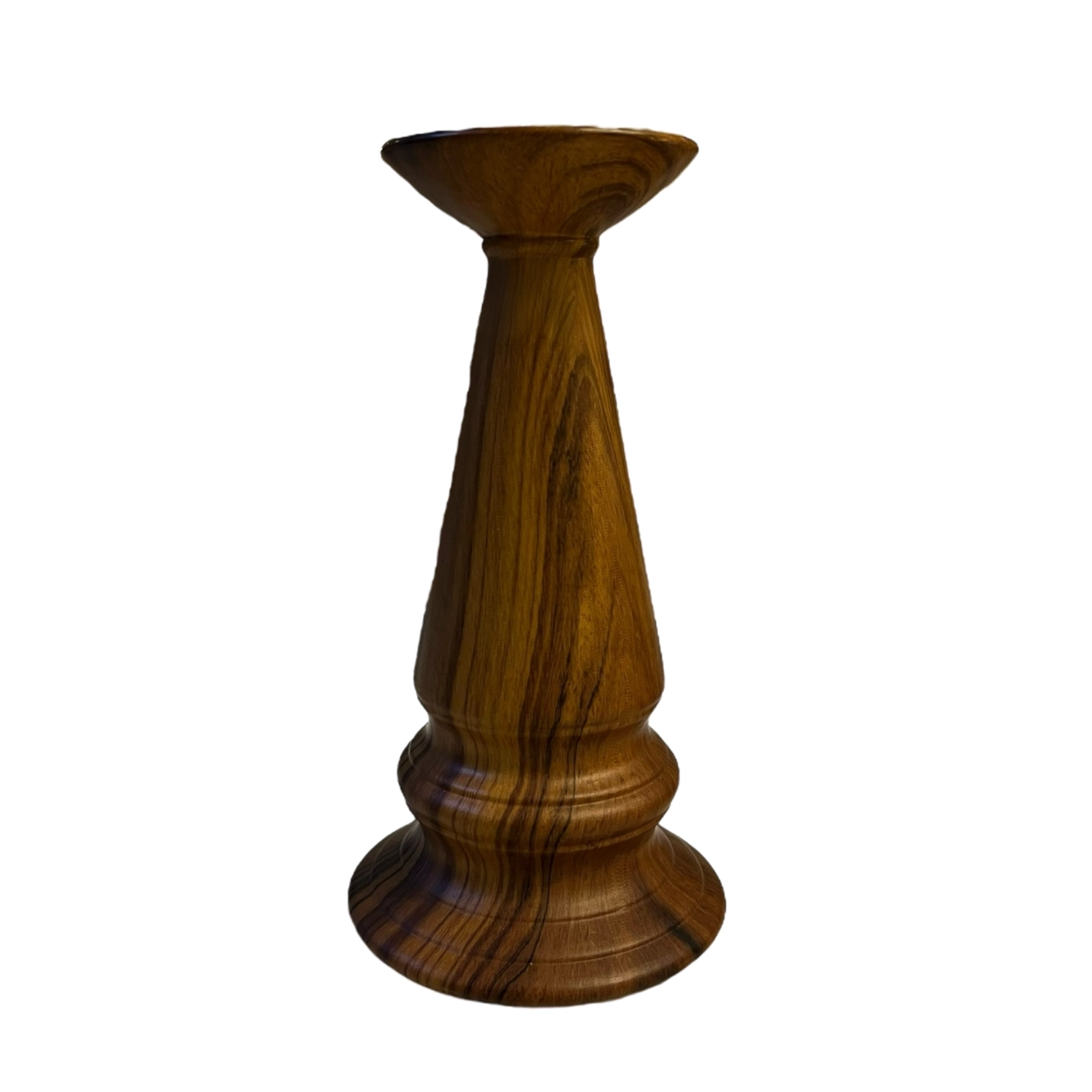 Portavelas de madera en tono oscuro. Diseño cónico con base acampanada para un toque rústico y elegante.