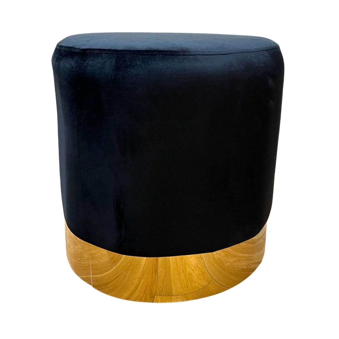 Puff cilíndrico de terciopelo negro con base de madera clara. Perfecto como asiento adicional o decorativo.