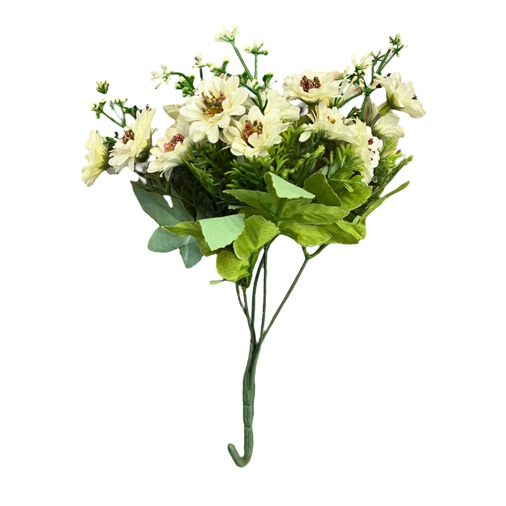 Racimo de flores artificiales blancas con detalles rojizos y hojas verdes. Ideal para decoraciones elegantes.