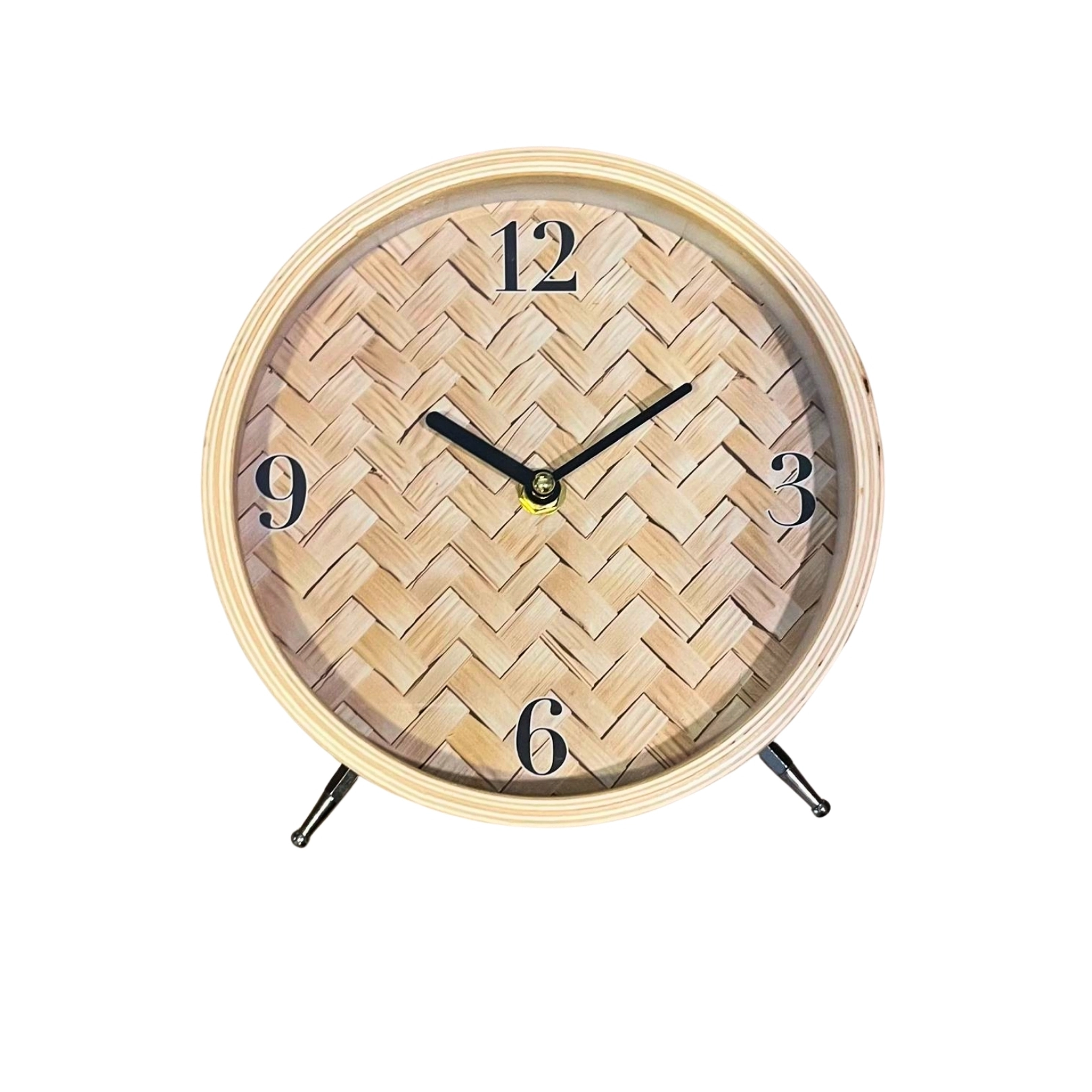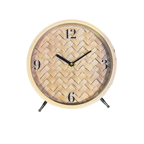 Reloj de mesa de ratán con diseño rústico y manecillas negras. Ideal para un toque natural y acogedor en cualquier espacio.