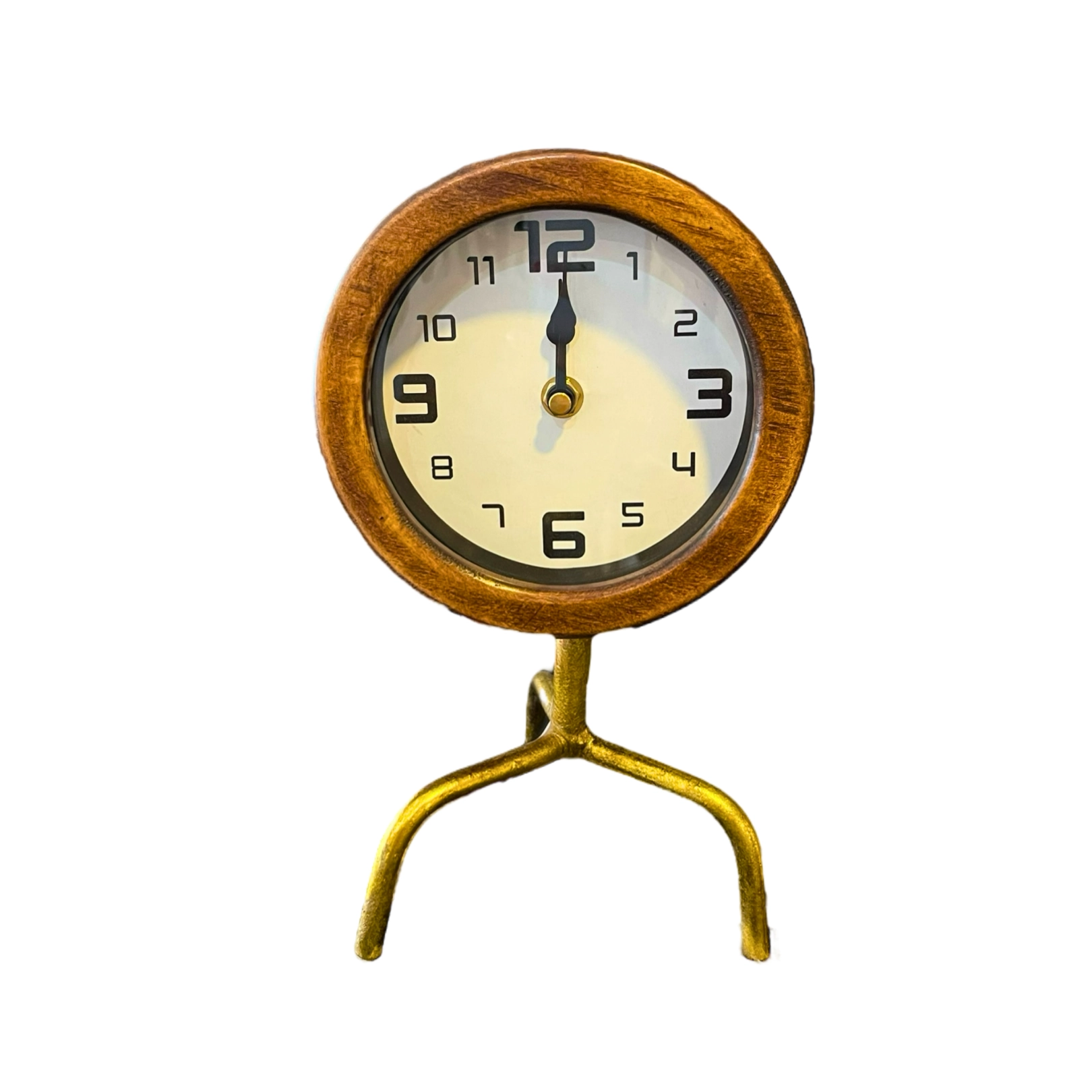 Reloj de mesa redondo con marco de madera y base dorada. Diseño clásico y funcional