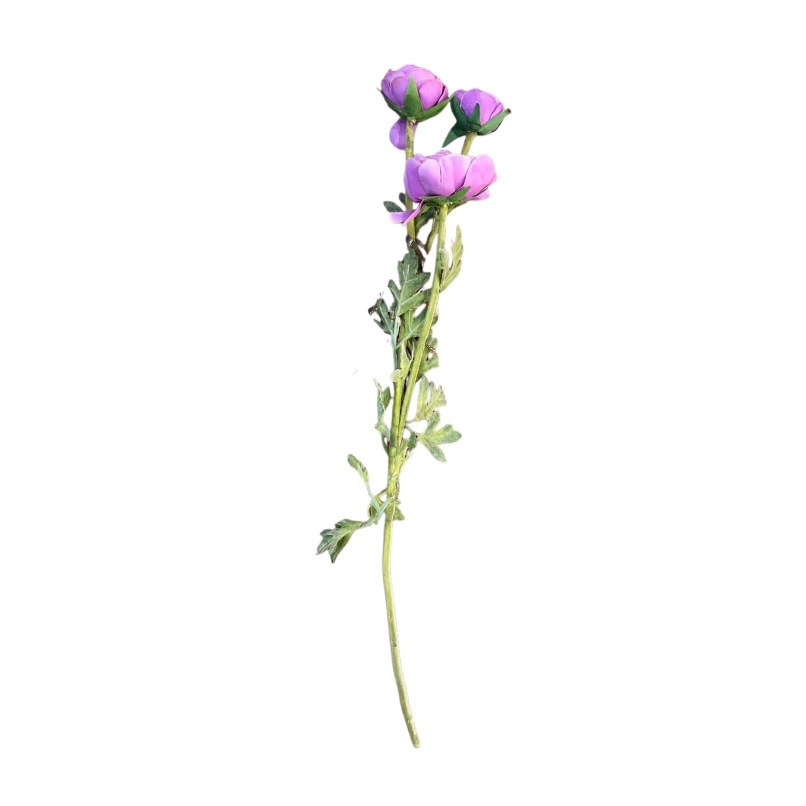 Flor inglesa morada artificial. Tallo único con tres capullos y hojas verdes, ideal para decoración delicada.