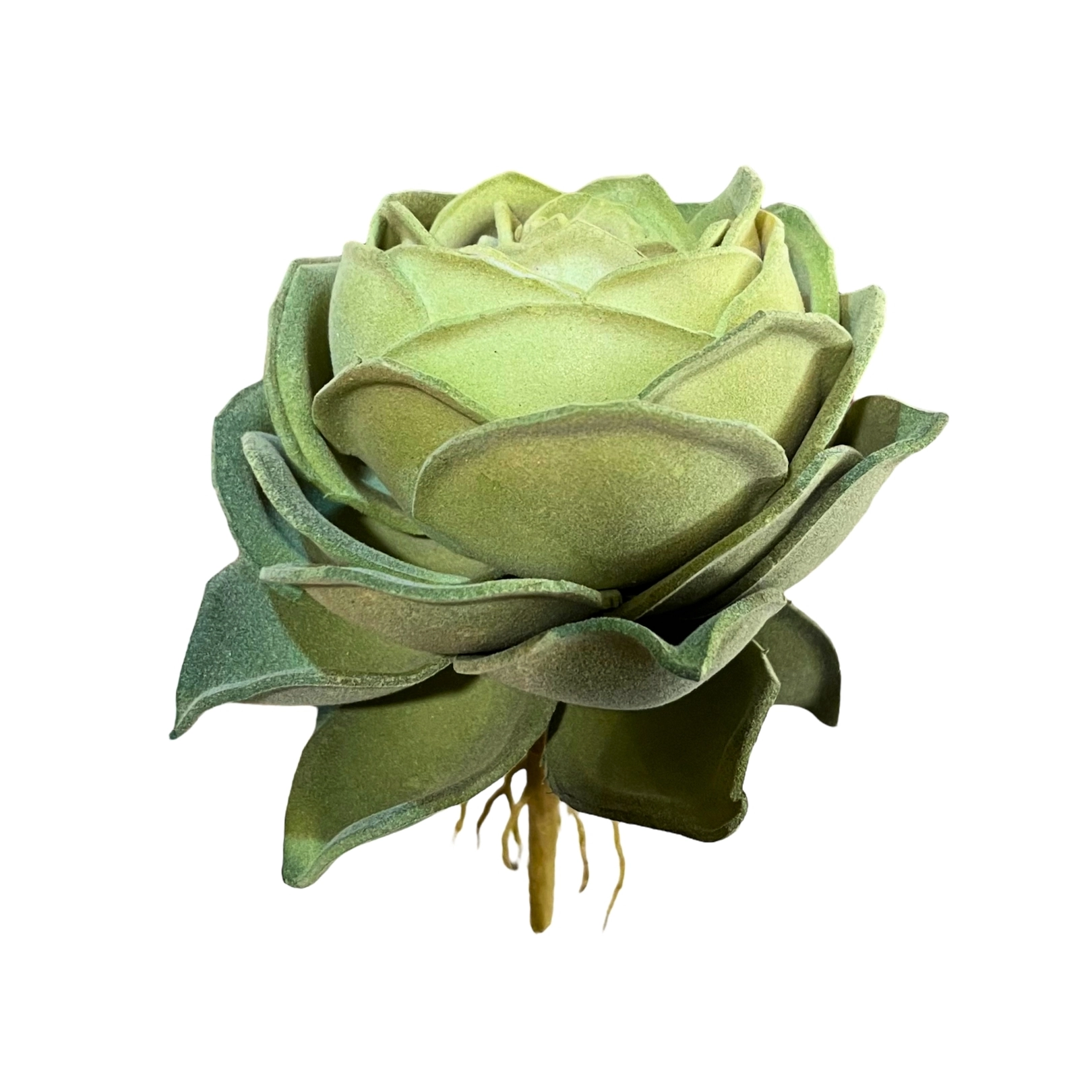 Suculenta artificial verde pálido con pétalos aterciopelados. Ideal para decorar cualquier espacio.