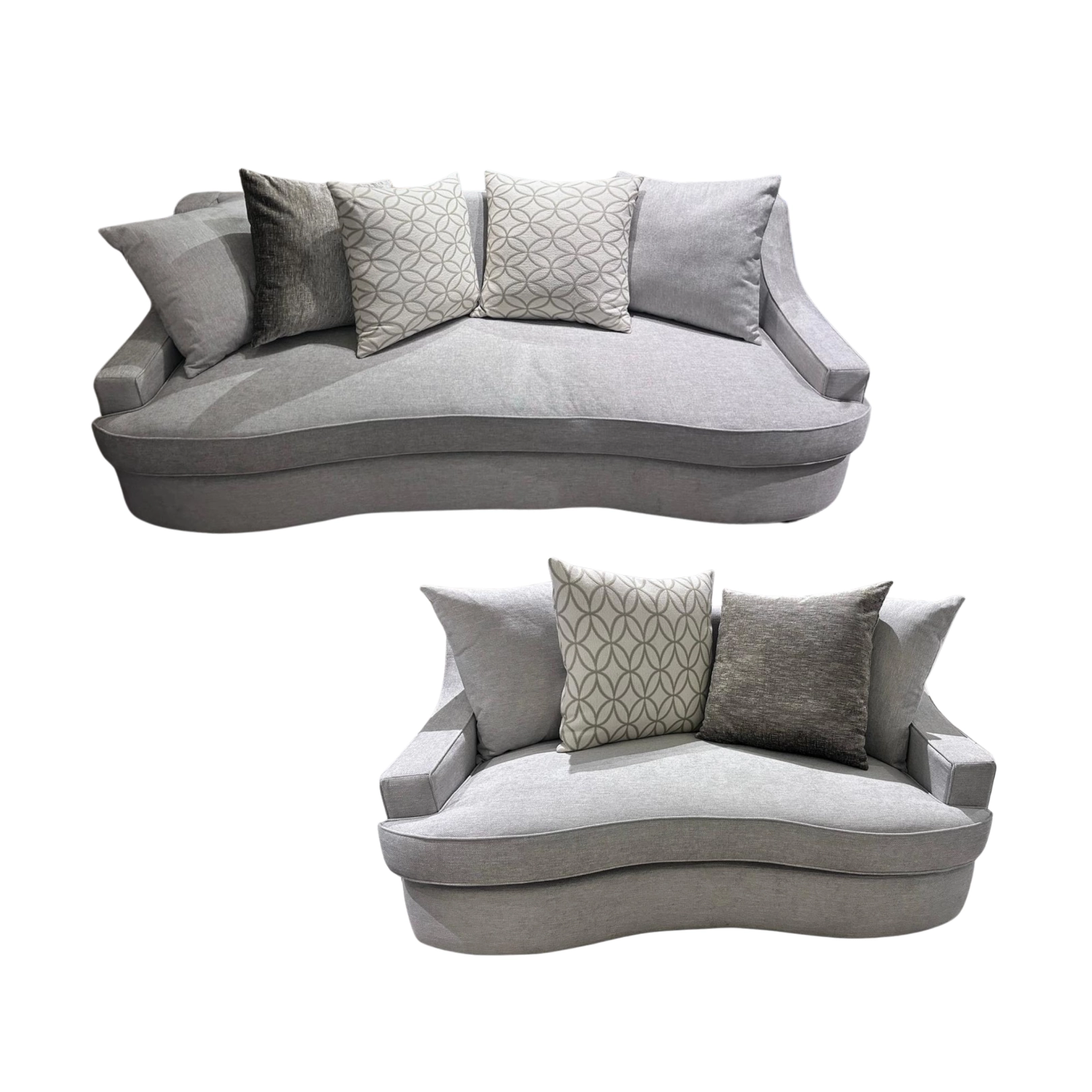 Conjunto de dos sillones curvos en gris claro, con un diseño moderno y elegante que aporta comodidad y estilo a la sala. Grande 240 cm de largo x 100 x 85 de alto. Chico 180 cm de largo x 100 de ancho y alto de 85