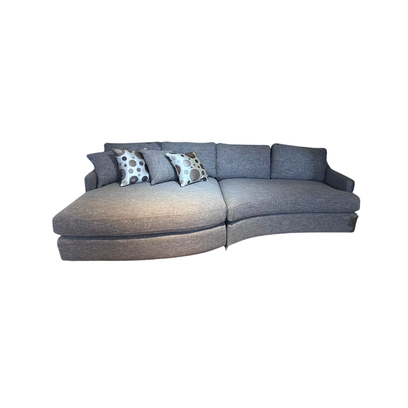 Sala de estar moderna y acogedora con un sofá seccional curvo gris. Ideal para el confort, se complementa con cojines decorativos que añaden un toque de color y estilo.