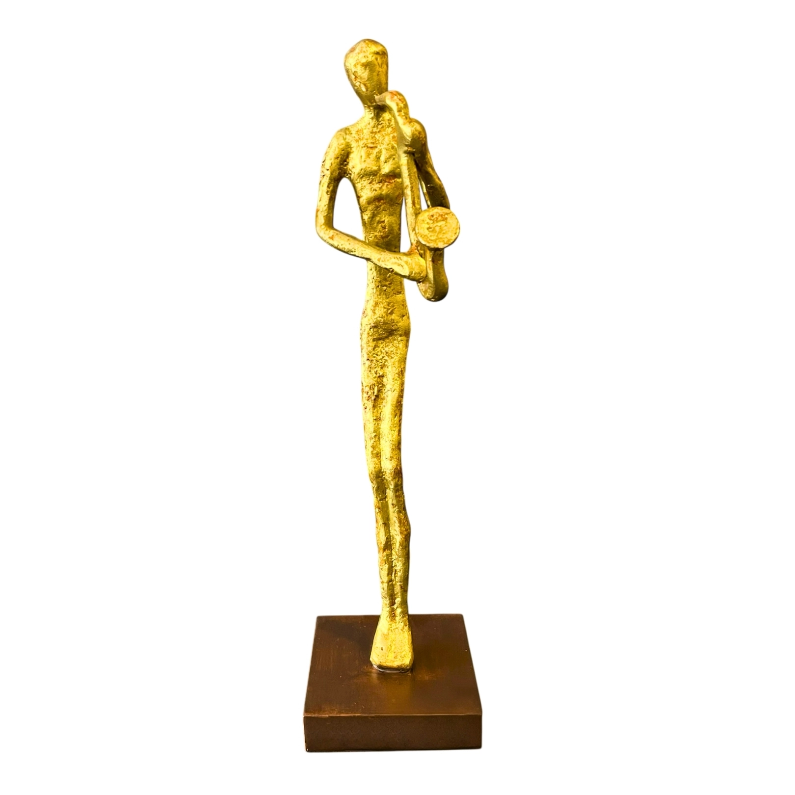 Escultura dorada de un saxofonista. Ideal para decorar cualquier espacio.