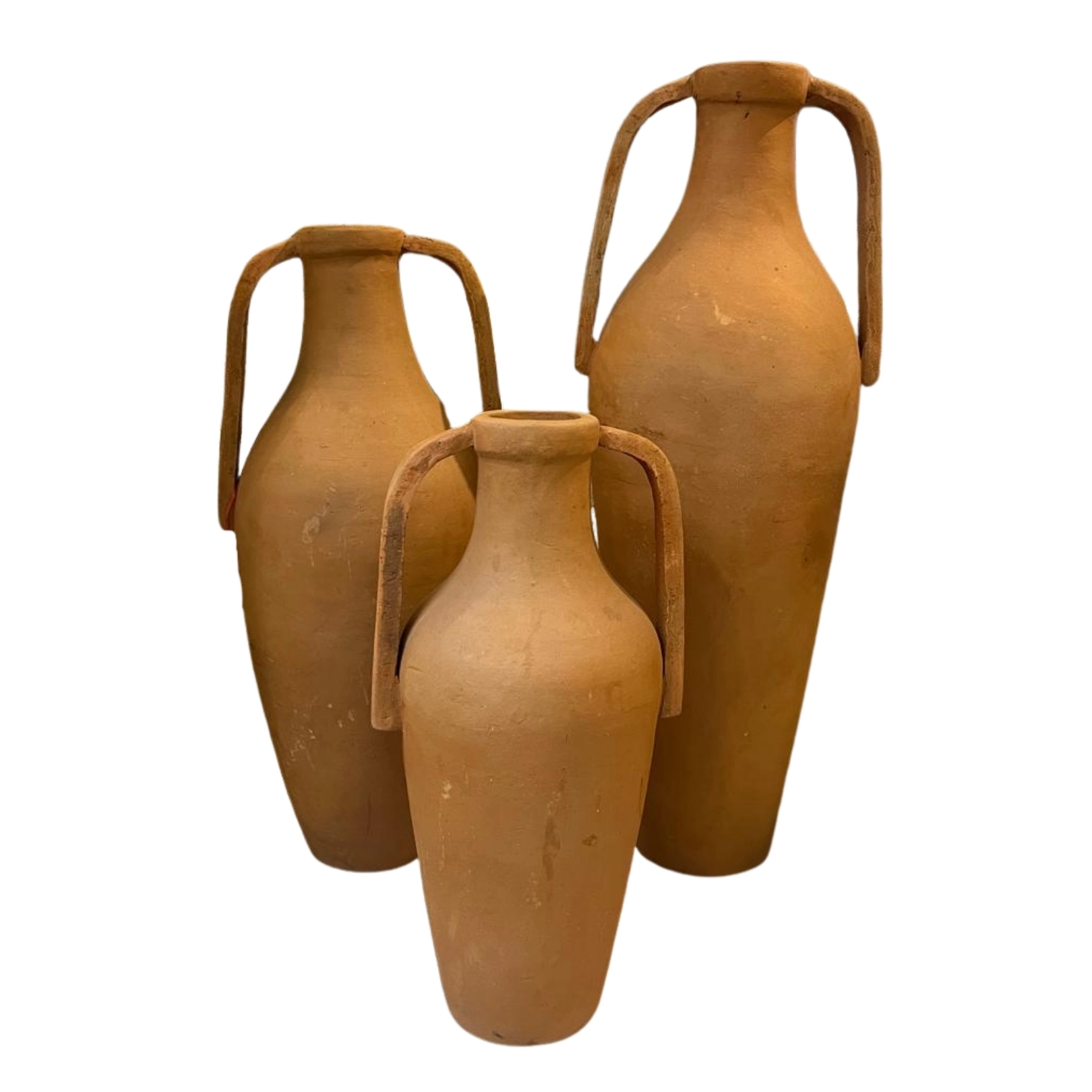 Set de tres jarrones de barro rústico con asas, disponibles en tres tamaños: chico (71×35 cm), mediano (92×38 cm) y grande (112×39 cm). Perfectos para aportar un toque artesanal a cualquier decoración