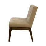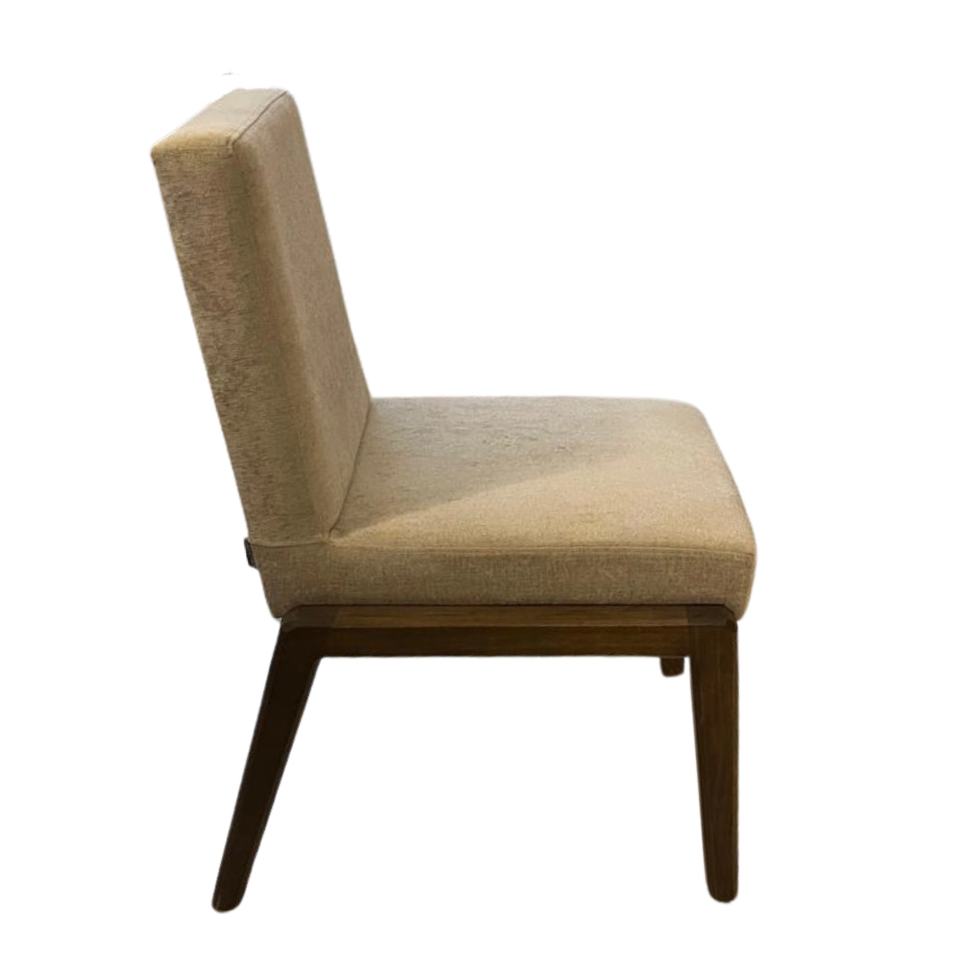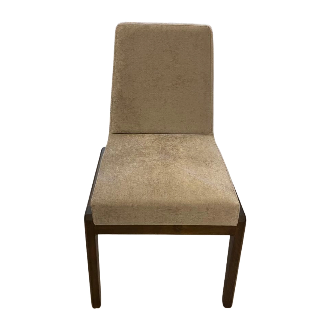 Silla de comedor moderna y elegante en tela beige claro. Comodidad con respaldo curvado y asiento acolchado, complementada por patas de madera oscura.