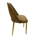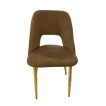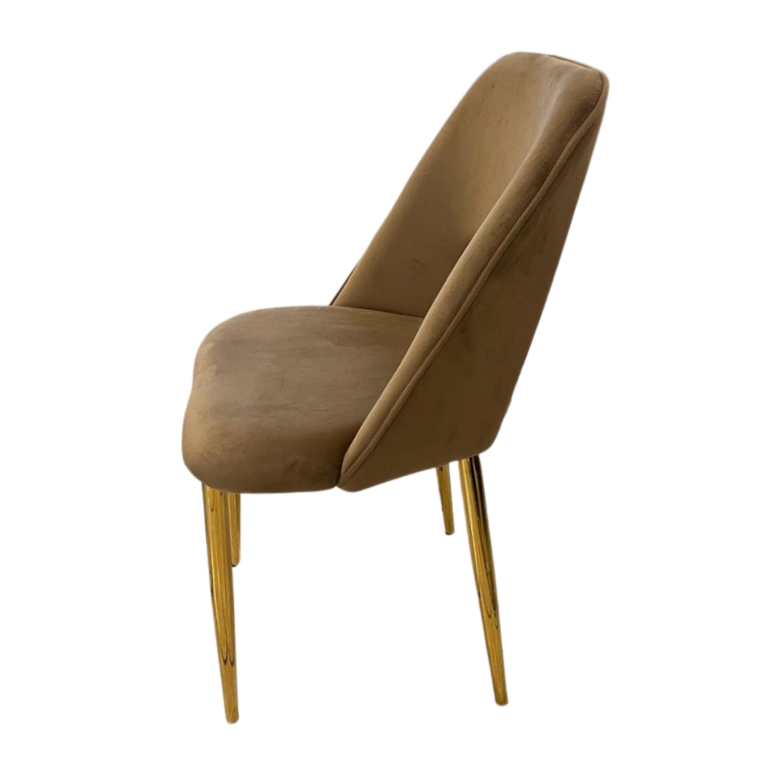Silla individual de terciopelo marrón claro con patas doradas, diseño moderno y minimalista, ideal para cualquier espacio.