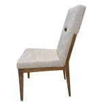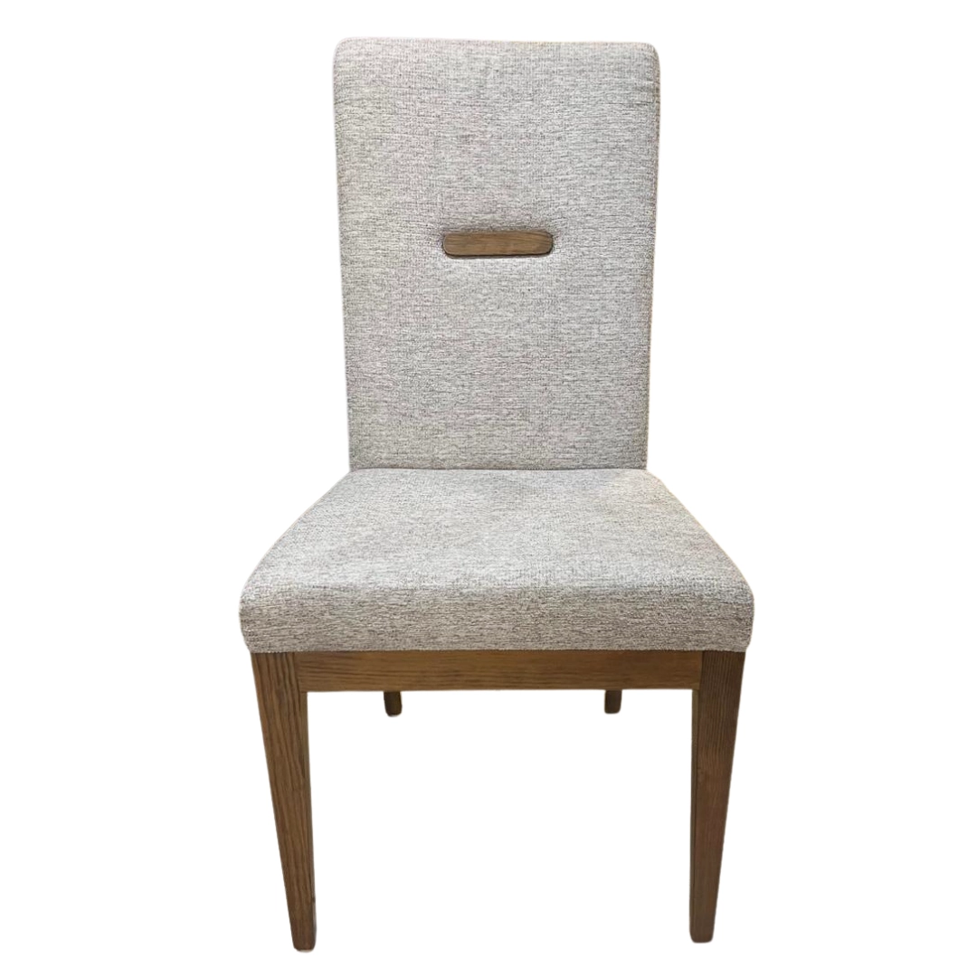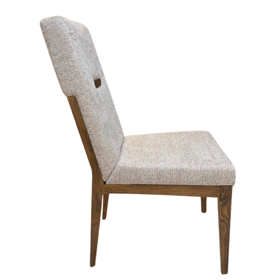 Silla de comedor moderna con tapizado gris claro y marco de madera oscura, perfecta para un comedor contemporáneo.