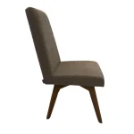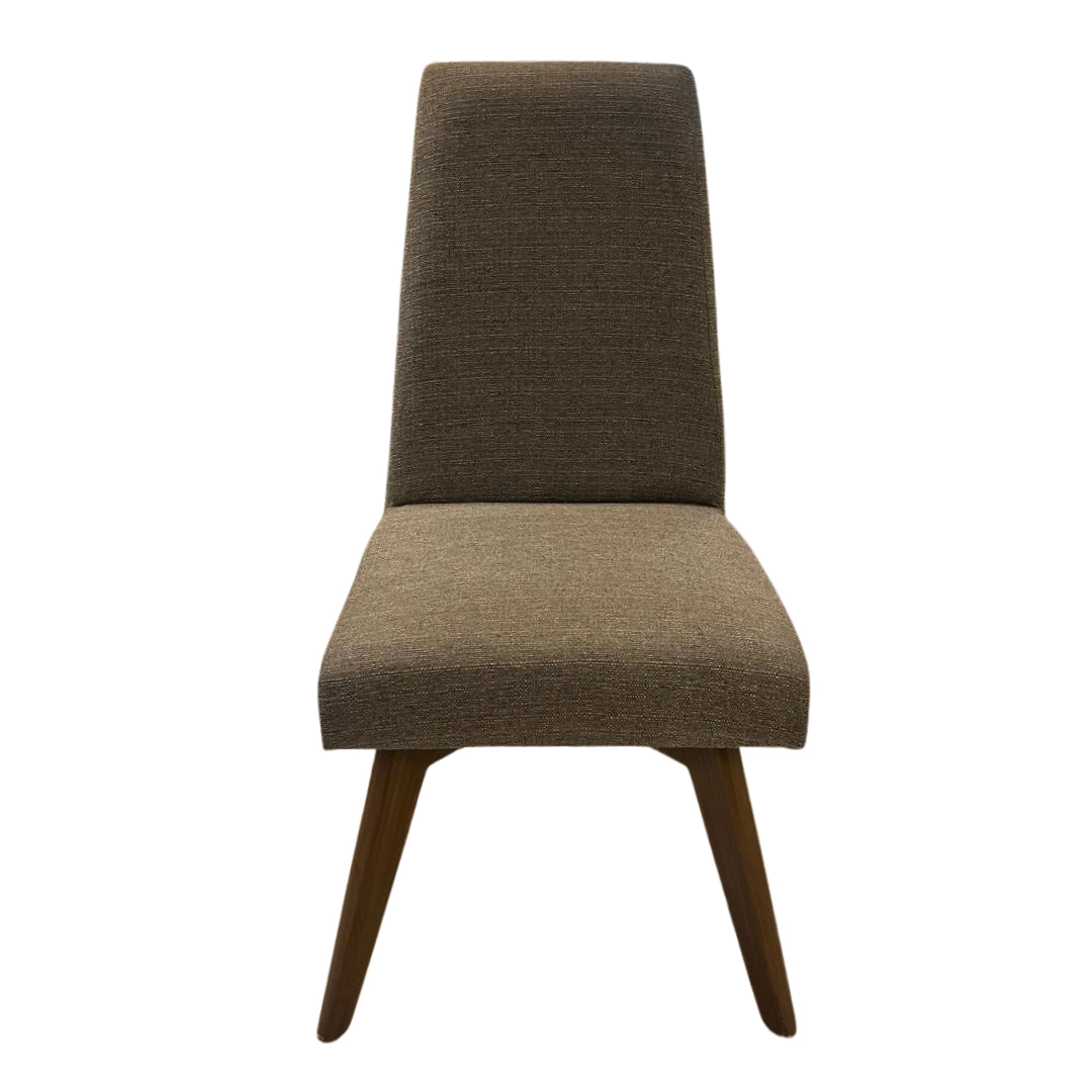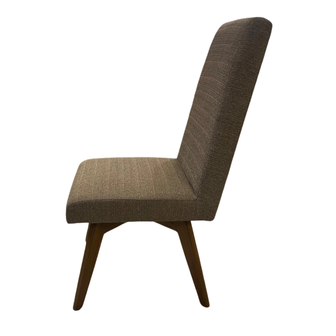 Silla de comedor con patas de madera oscura, asiento y respaldo de tela gris oscuro. Diseño moderno y minimalista.