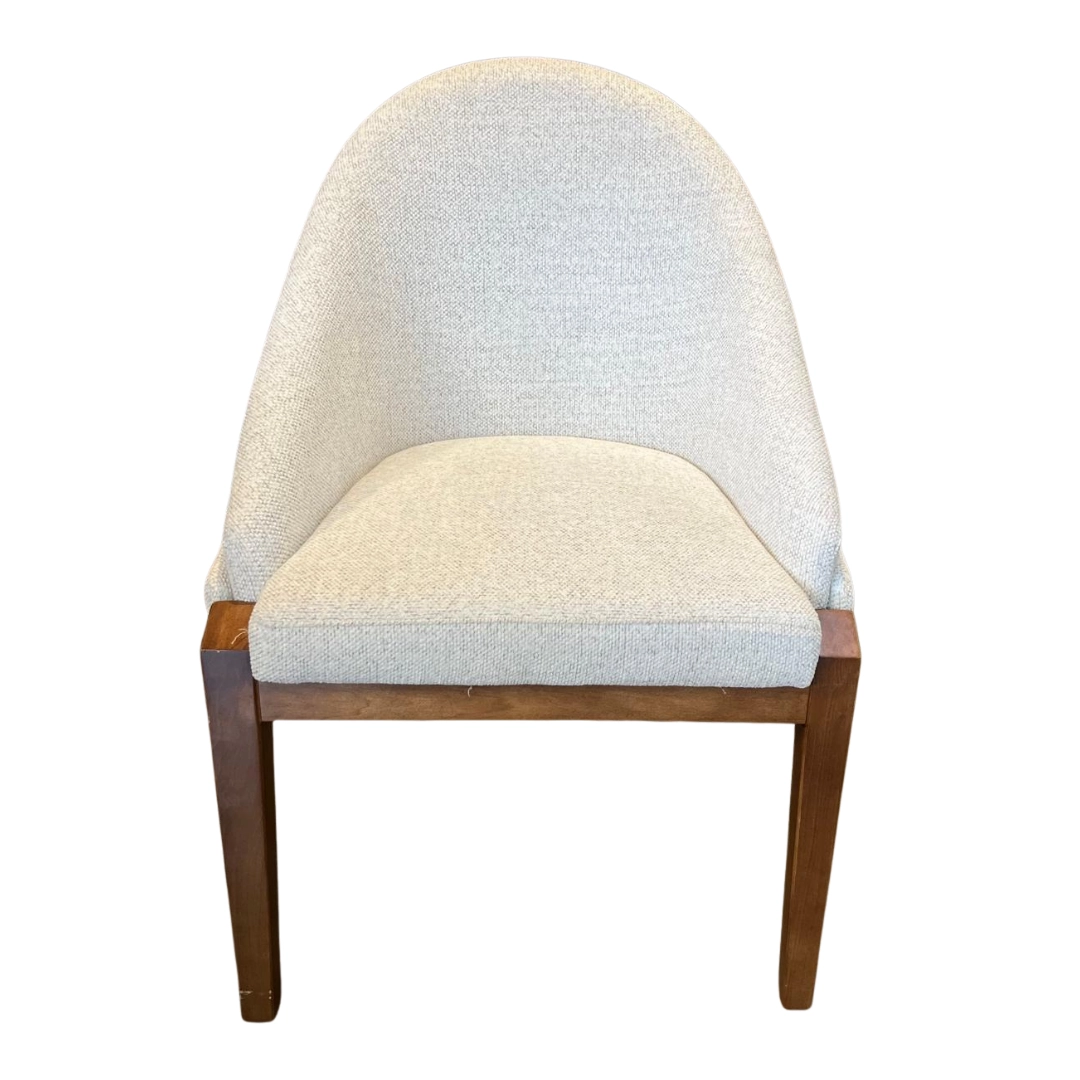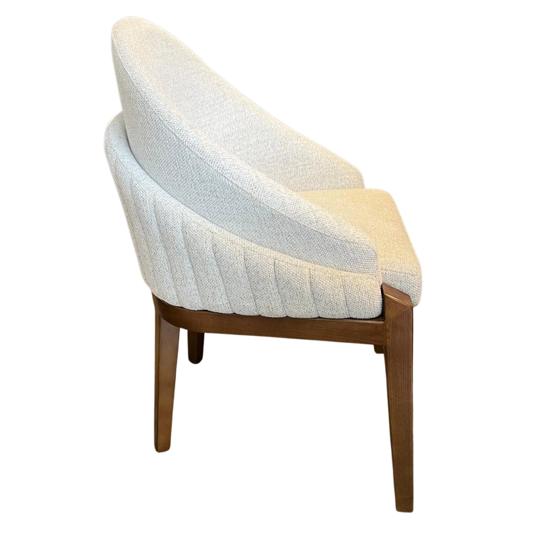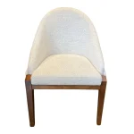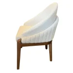 Silla moderna con tapizado blanco y respaldo redondeado. Patas de madera clara que aportan elegancia. Ideal para espacios contemporáneos.
