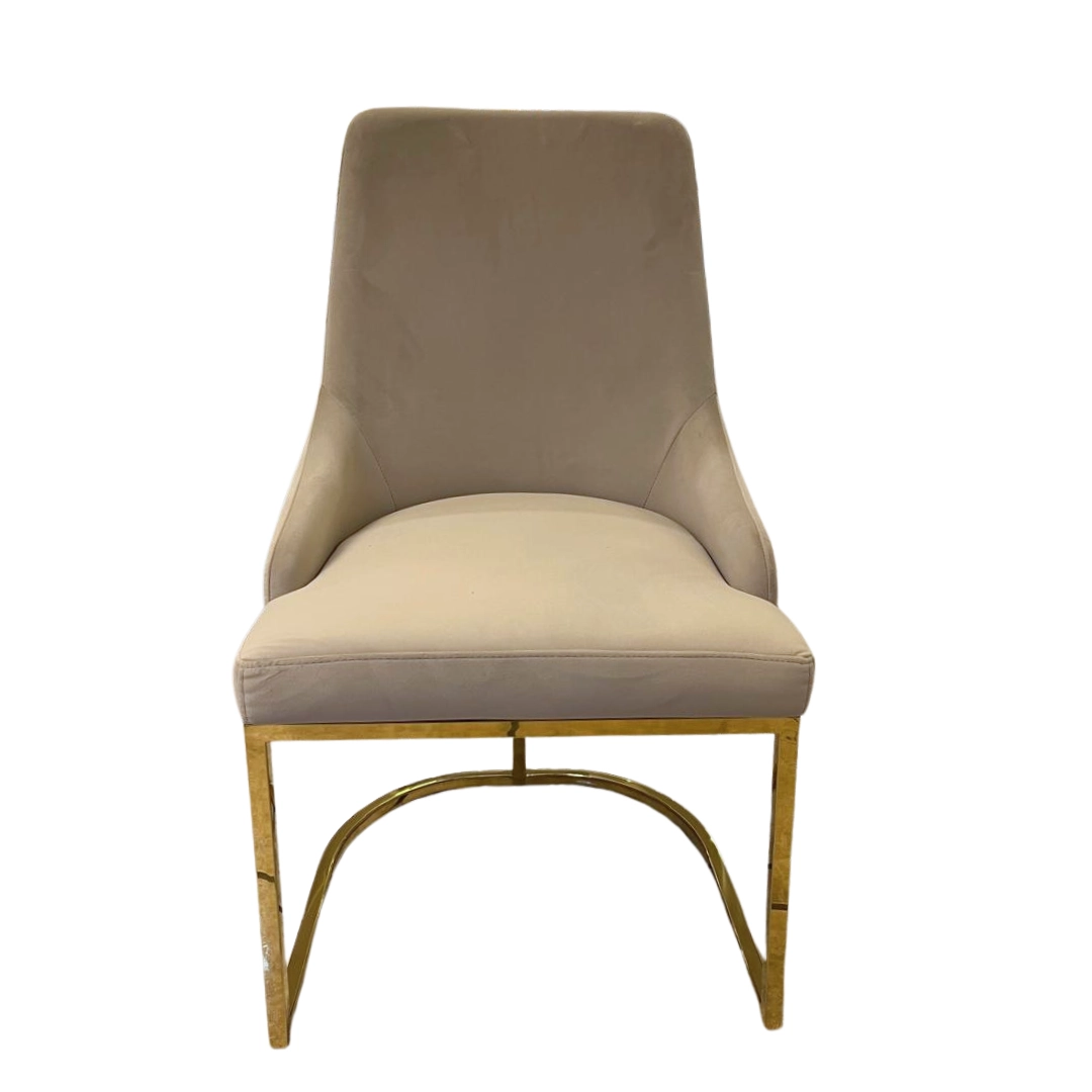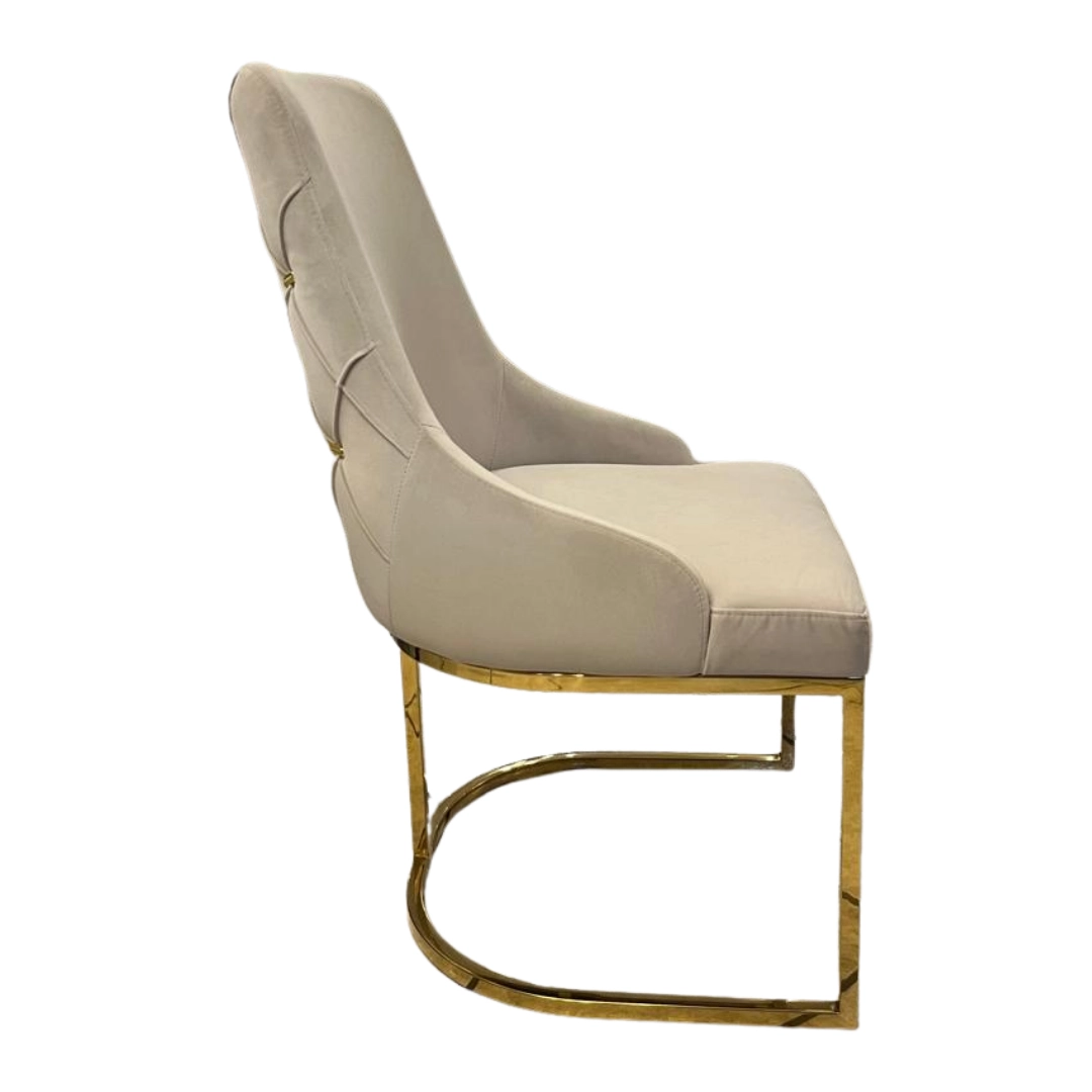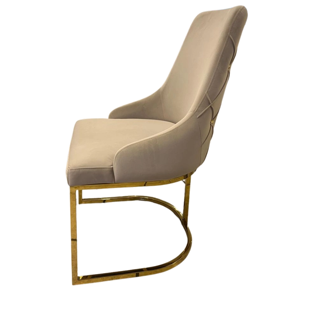 Silla tapizada en terciopelo beige con estructura dorada. Un toque de lujo y confort moderno para tu hogar.