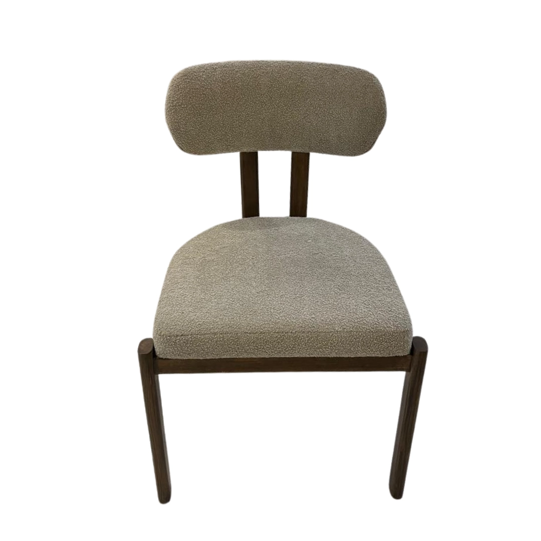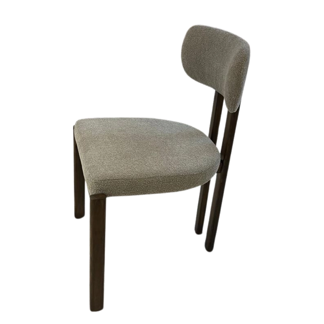Silla Neli silla tapizada en beige con patas de madera oscura, perfecta para cualquier ambiente.