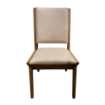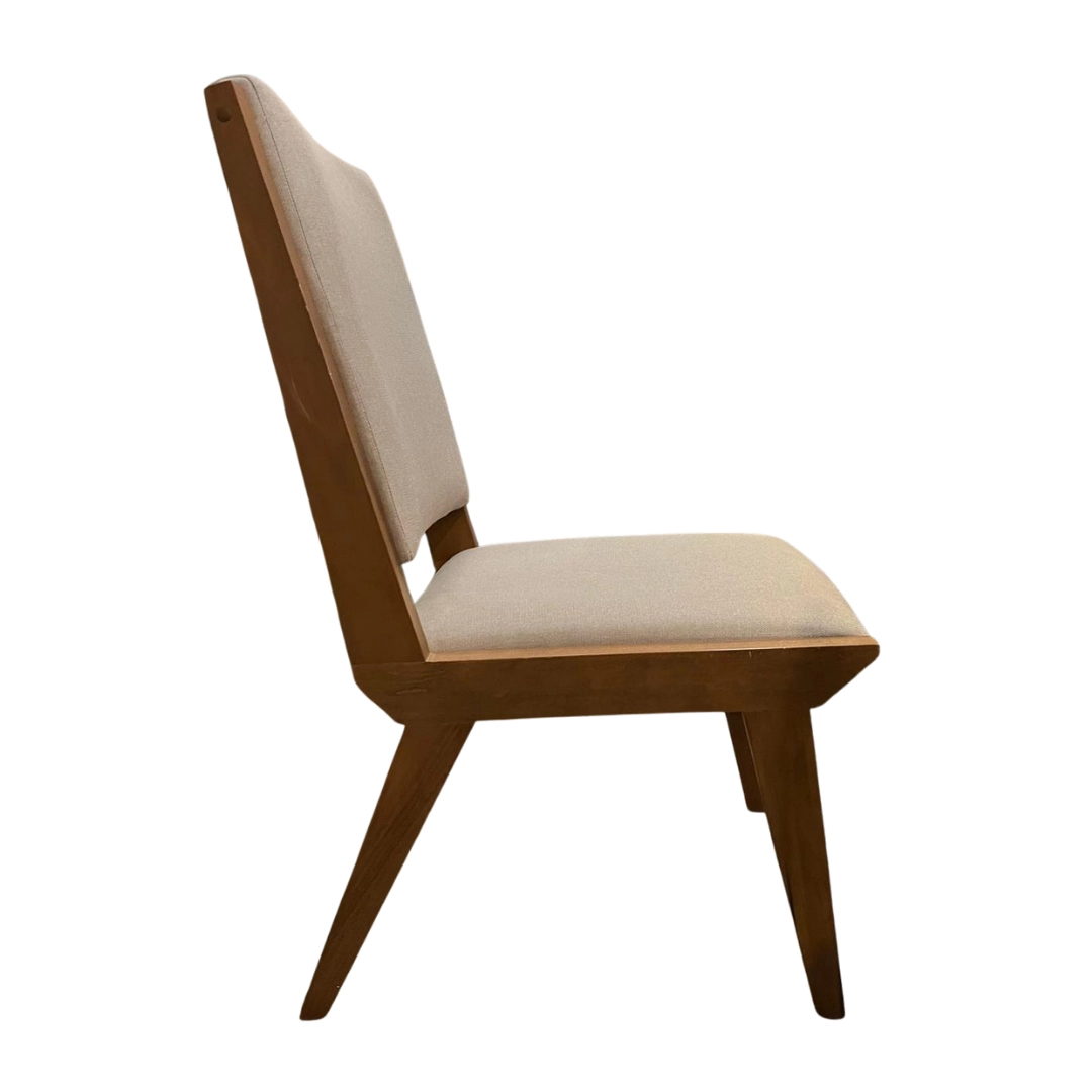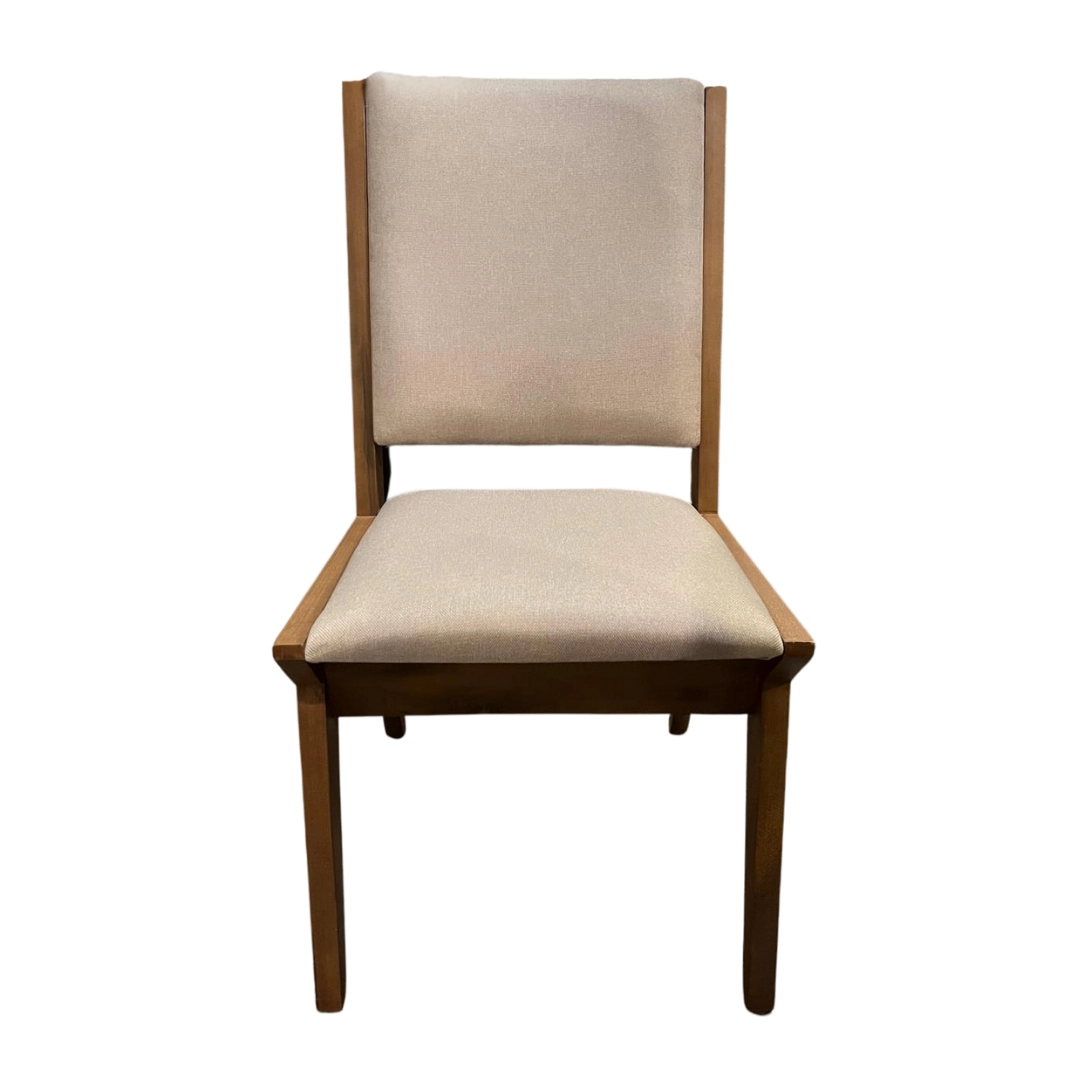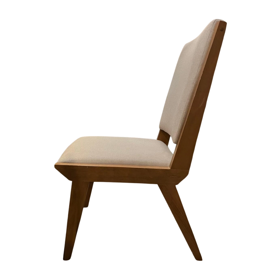 Silla de comedor moderna de madera clara con patas delgadas y tapizado beige, que combina comodidad y estilo.
