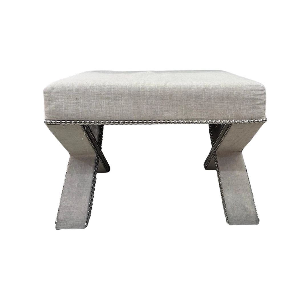 Taburete tapizado en lino gris claro, con base en ‘X’ y detalle de tachuelas plateadas. Un toque de elegancia.