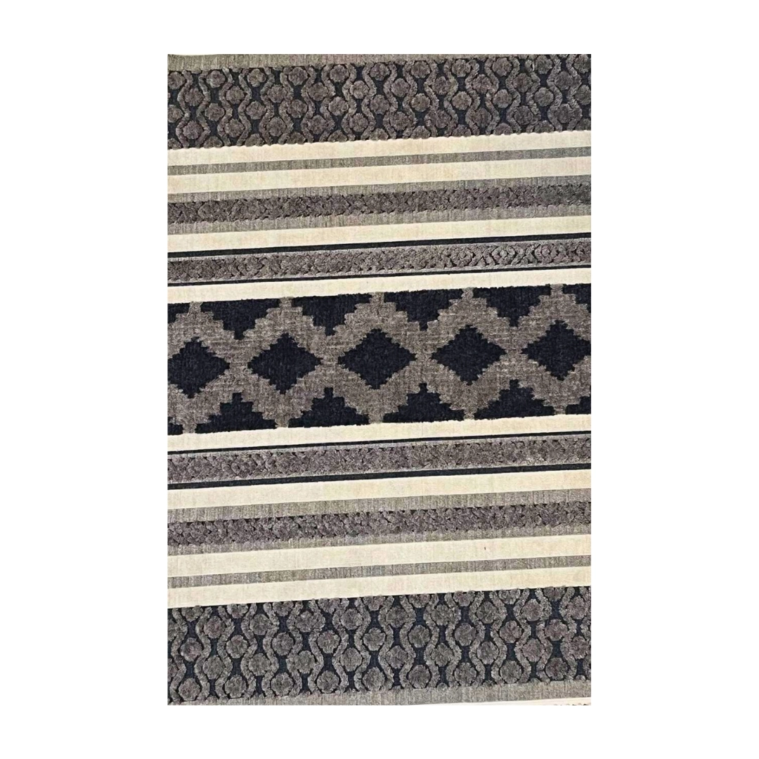 Tapete geométrico en azul marino, blanco y gris, con franjas texturizadas que añaden un toque moderno a cualquier ambiente.