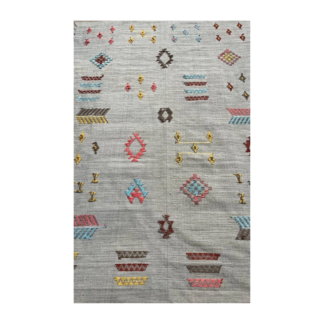 Tapete geométrico en gris claro con diseños vibrantes en rosa, azul, amarillo y marrón. Ideal para un toque moderno.
