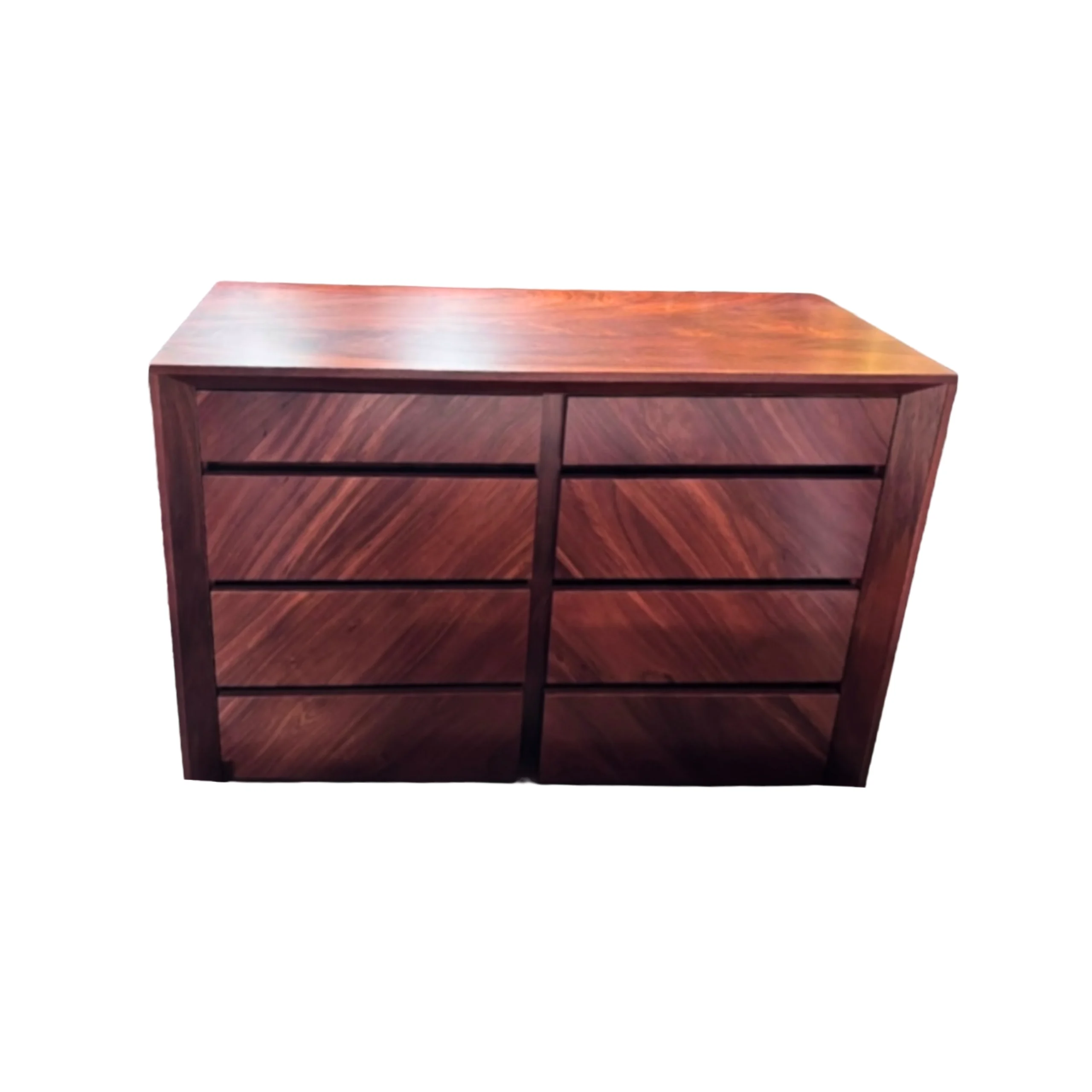 Tocador de madera rojiza oscura con un acabado texturizado, que combina un diseño rústico y funcional.