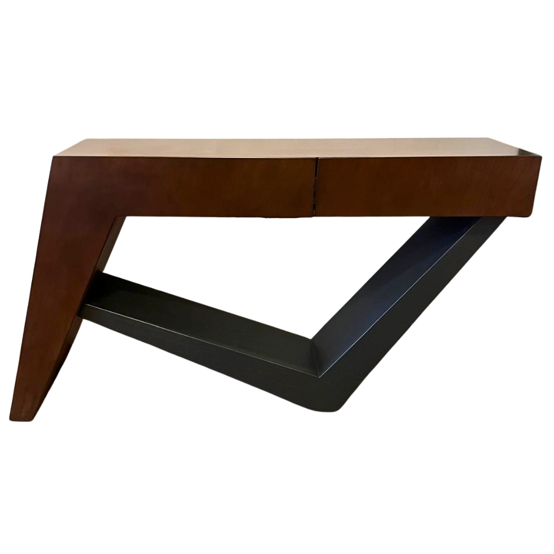 Trasofa, consola moderna de madera oscura con estructura de acero negro. Diseño minimalista y elegante.