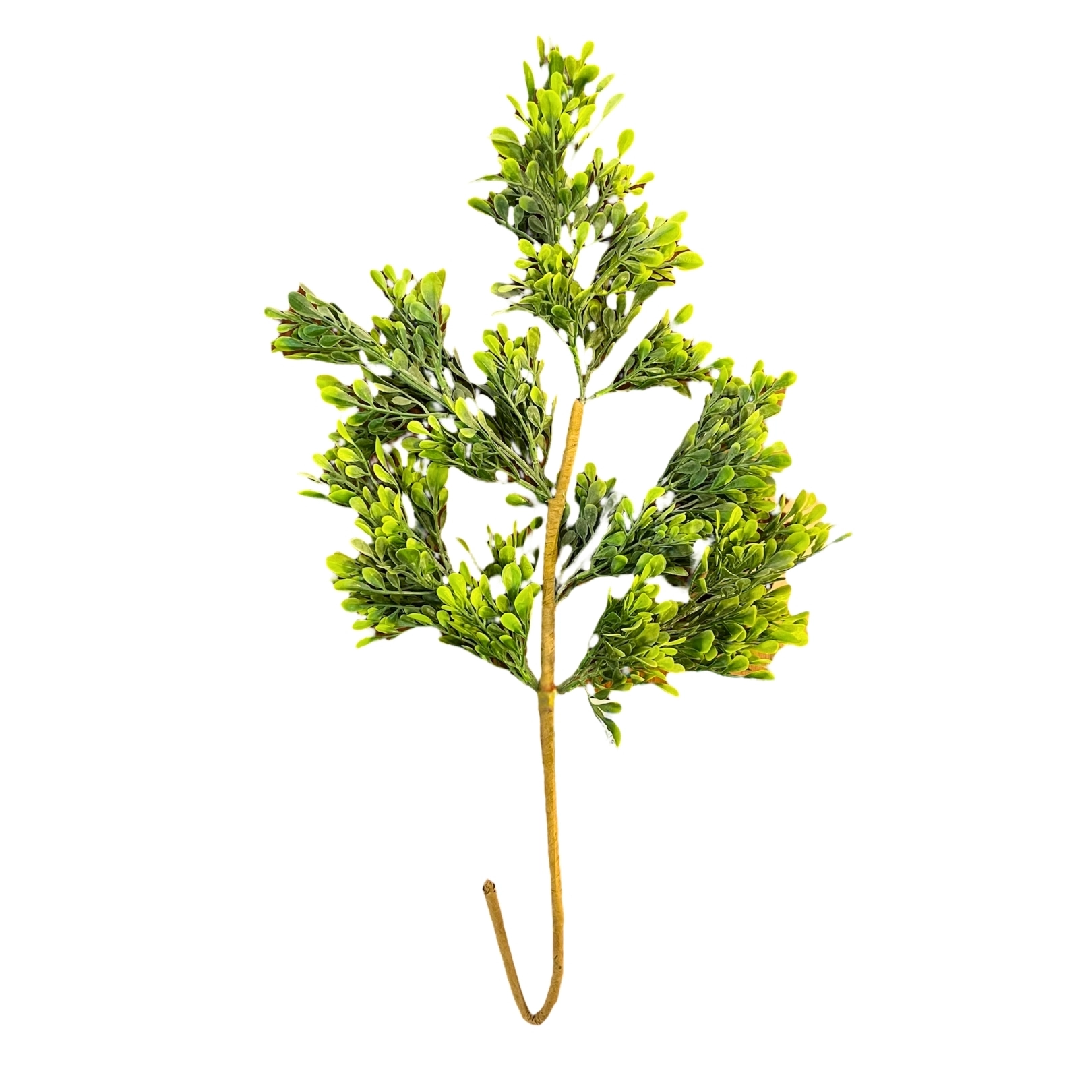 Rama decorativa con hojas verdes de acabado natural, ideal para aportar frescura y estilo a cualquier espacio, ya sea sola en un florero o como complemento en arreglos decorativos